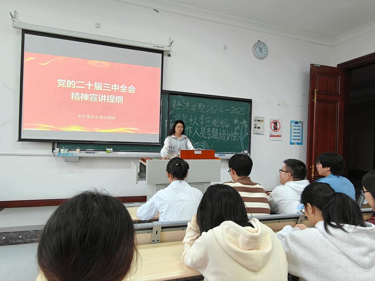 随后,学生会主席方青引领全体成员深入学习了党的二十届三中全会精神。此次会议是在以习近平同志为核心的党中央领导下,于中国式现代化全面推进强国建设和民族复兴伟业的关键时期召开的一次重要会议。方青从会议的深远意义、核心内容以及重大战略举措等多个维度,进行了系统而深入的阐释。这次宣讲极大地激发了团学干部作为新时代青年的责任感与使命感,促使他们更加明确自身的历史重任与时代担当。